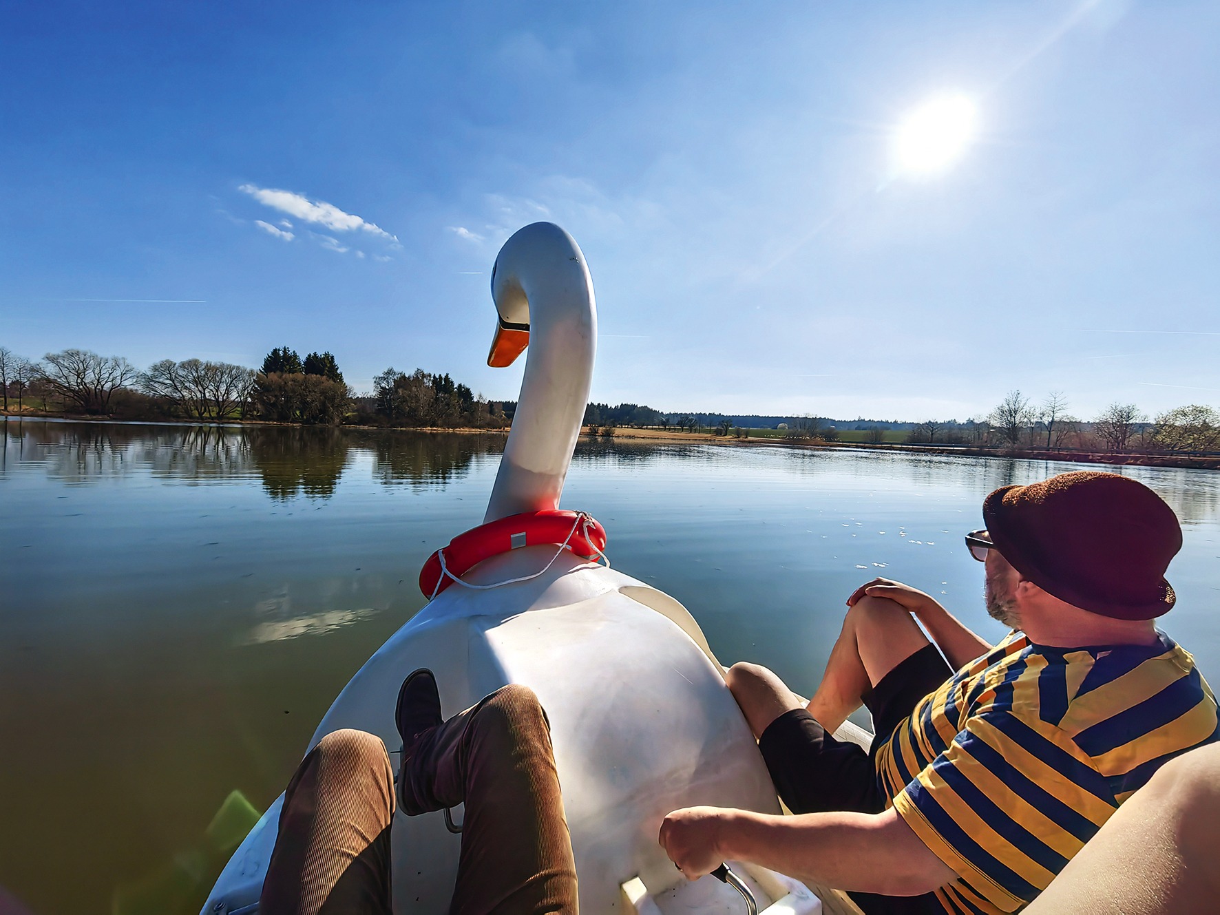 Když ji přivezli, tři dny tam kroužil jeden labuťák a toužebně se s ní snažil navázat kontakt. Když se pak vrátil do party, asi tam hned hlásil: „Kluci, nebudete mi věřit, co jsem viděl. Tááákhle obrovská byla...“ Do labutě musíte ve dvou, jinak to neušlapete. Chytré omezení. Potřebujete parťáka. Má dole i kolečka, takže je to vlastně labuť obojživelník. Jak z Fantomase. Můžete s ní pak i šlapat po silnici. Při šlapání mi vypráví, jak teď se Svěrákem dělal tu parafrázi na Kolju. Jak volal jednomu dobrovolnému hasiči, který koordinuje pomoc Ukrajině, a ten pán se představil pan Dobrovolný. A spousta dalších šíleností.